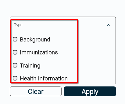 How to View and Filter Requirements in a Web Browser (Students) Log in to the MyCCPS using a web browser.Click on Requirements.The Requirements screen will display all rotation requirements along with their current status.Requirements are grouped into:Hospital System-wideProvider-specificSchool-specific4. To narrow your results, tap or click the Filter icon.5. The filter panel will open with available filtering options.6. To filter by requirement type:Open the Type dropdown.Select the checkbox(es) next to the type(s) you want to view.7. To filter by requirement status:Open the Status dropdown.Select the checkbox(es) next to the status(es) you want to view.8. Click or tap Apply to update the requirements list based on your selected filters. Was this article helpful? 0 out of 0 found this helpful Yes No